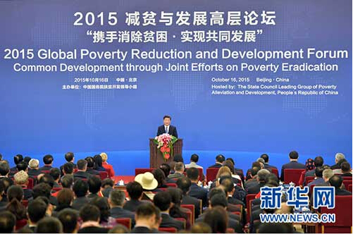 2015減貧與發展高層論壇16日在北京人民大會堂舉行。國家主席習近平出席論壇并發表題為《攜手消除貧困 促進共同發展》的主旨演講。習近平強調,消除貧困是人類的共同使命。改革開放30多年來,中國走出了一條中國特色減貧道路。中國在致力于自身消除貧困的同時,積極展開南南合作,同舟共濟,攻堅克難,支持和幫助廣大發展中國家特別是最不發達國家消除貧困,為各國人民帶來更多福祉。